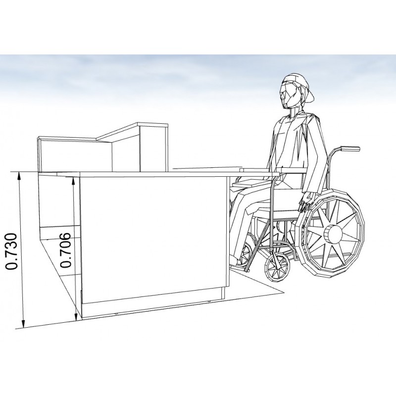 Banque d'accueil avec module PMR conforme aux normes en vigueur (Arrêté du 20 avril 2017 relatif à l'accessibilité aux personnes handicapées des établissements recevant du public) en bois aggloméré haute densité mélaminé, finition haute qualité avec 5 déclinaisons disponibles.